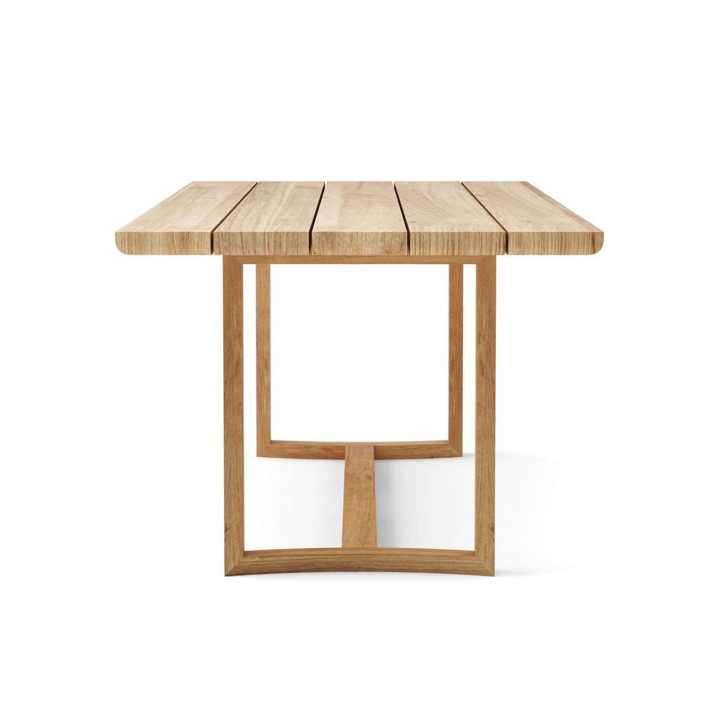 Elegant & Durable. Crafted from premium-grade unfinished teak, this sturdy 8.5-ft dining table offers timeless durability for outdoor gatherings. Featuring a curved design with wide teak slats, it comfortably fits six Toscana Dining Chairs—perfect for entertaining. Includes an umbrella hole with plug for convenience.
