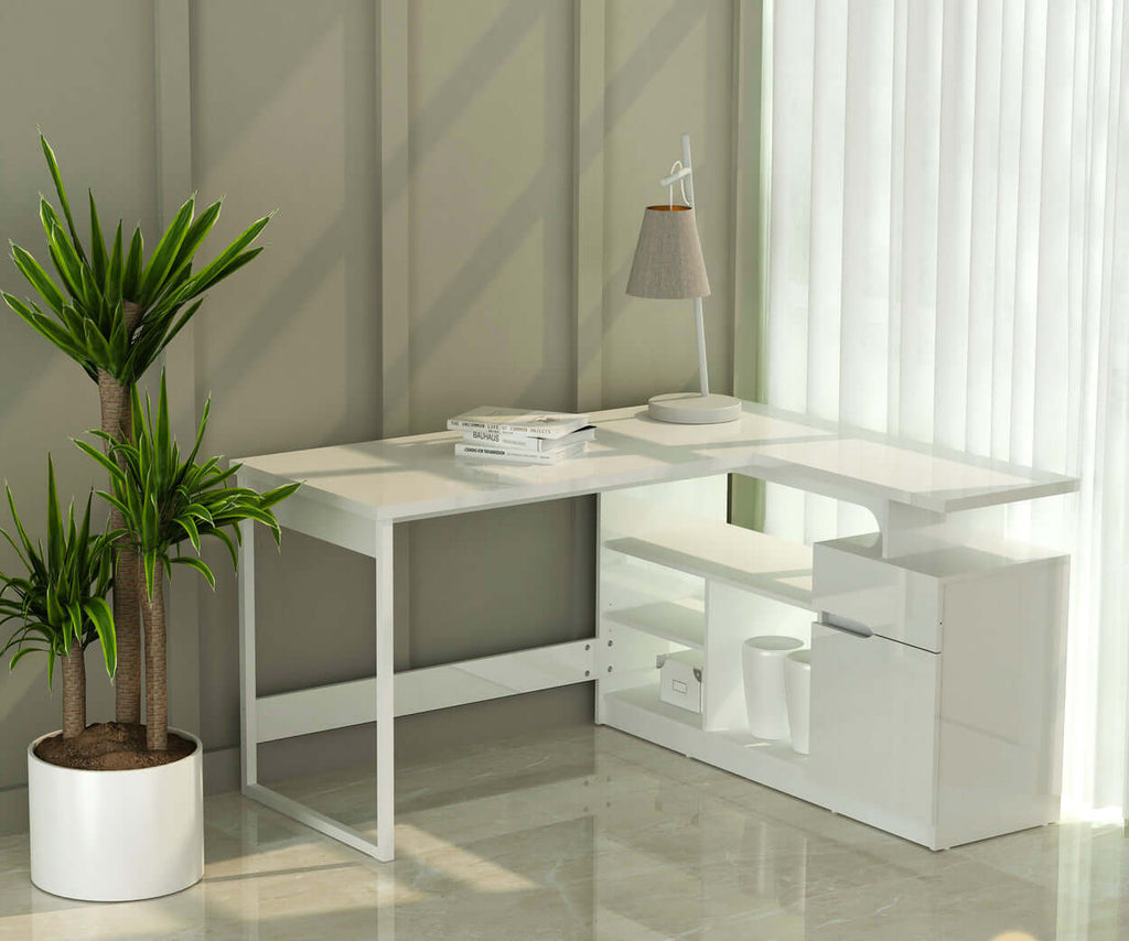 Upgrade your workspace with this modern contemporary L-Shaped corner desk, designed for both style and practicality. Its spacious layout comfortably holds computers, phones, printers, and more, with a grommet hole for seamless cable management. Five storage compartments and a smooth-gliding drawer keep essentials organized for easy access. Crafted with metal legs and engineered wood, it features a gloss white PVC laminate finish that’s water-resistant and durable—perfect for home or office setups.