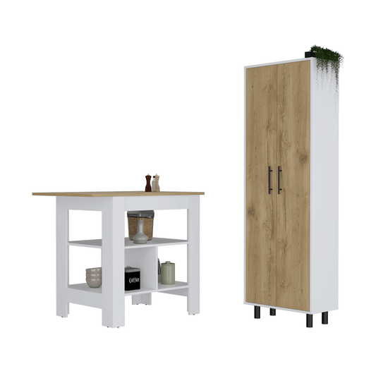 Light Oak and White Kitchen Island with Drawer Shelves and Casters