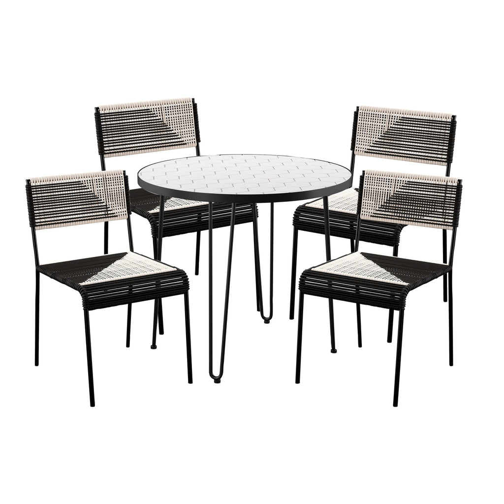 Enjoy al fresco dining with this weather resistant outdoor dining table. Serve drinks and appetizers from the white hexagon tile tabletop while sitting comfortably on black and white woven chairs. Slide this set onto your screened-in porch for game time with friends, or station in your breakfast nook for a relaxing weekend meal. Center your outdoor entertaining around this stylish table and chairs for family fun in any season.